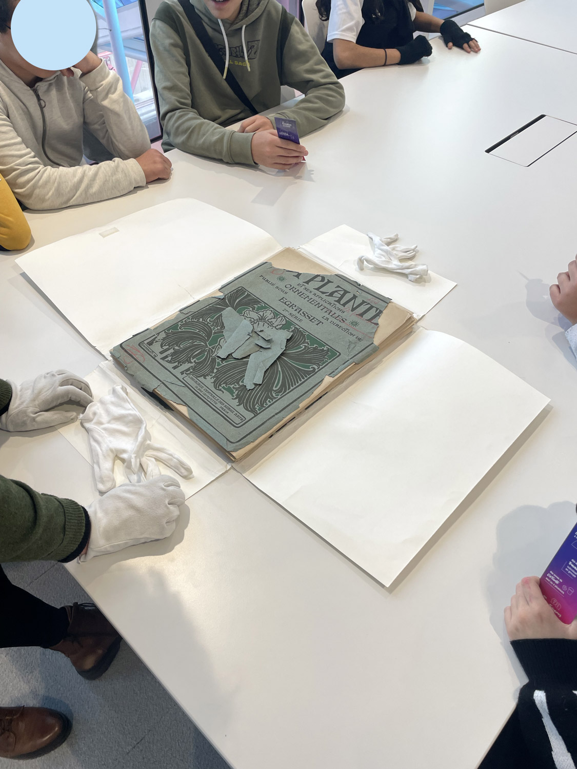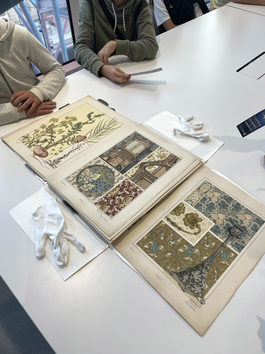 Nous sommes en train de regarder les tableaux sur l'École de Nancy, puis nous avons vu des dessins fait par les étudiants de l'école, et nous avons vu un folio (un livre sans être lié).