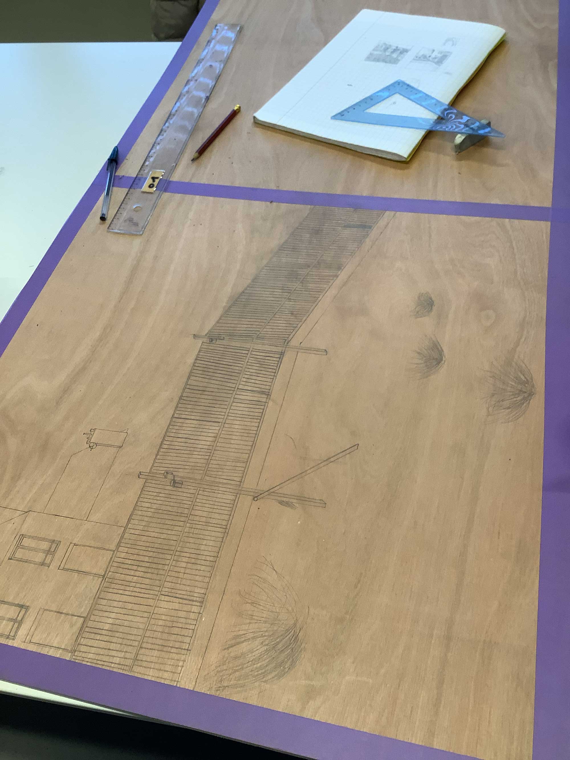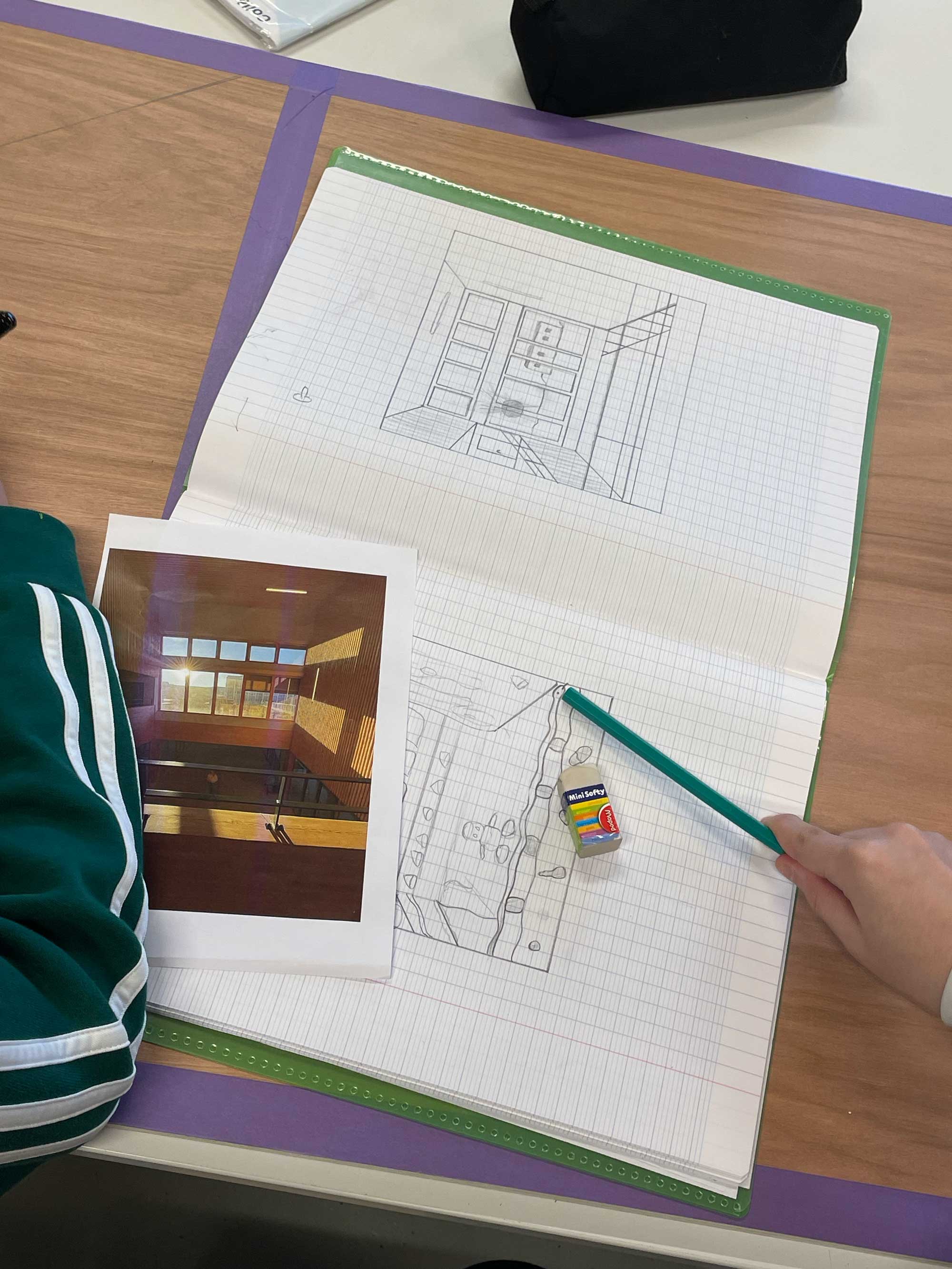 Chaque groupe a tout d’abord choisi un lieu du collège – un espace familier, quotidien – qu’il a photographié. À partir de cette image, les élèves ont réfléchi collectivement à une manière de représenter ce paysage à la fois de façon réaliste -description fidèle- et de façon imaginaire ou transformée. Ce travail a ainsi donné lieu à la réalisation de deux dessins complémentaires : l’un ancré dans l’observation, l’autre ouvert à l’invention.