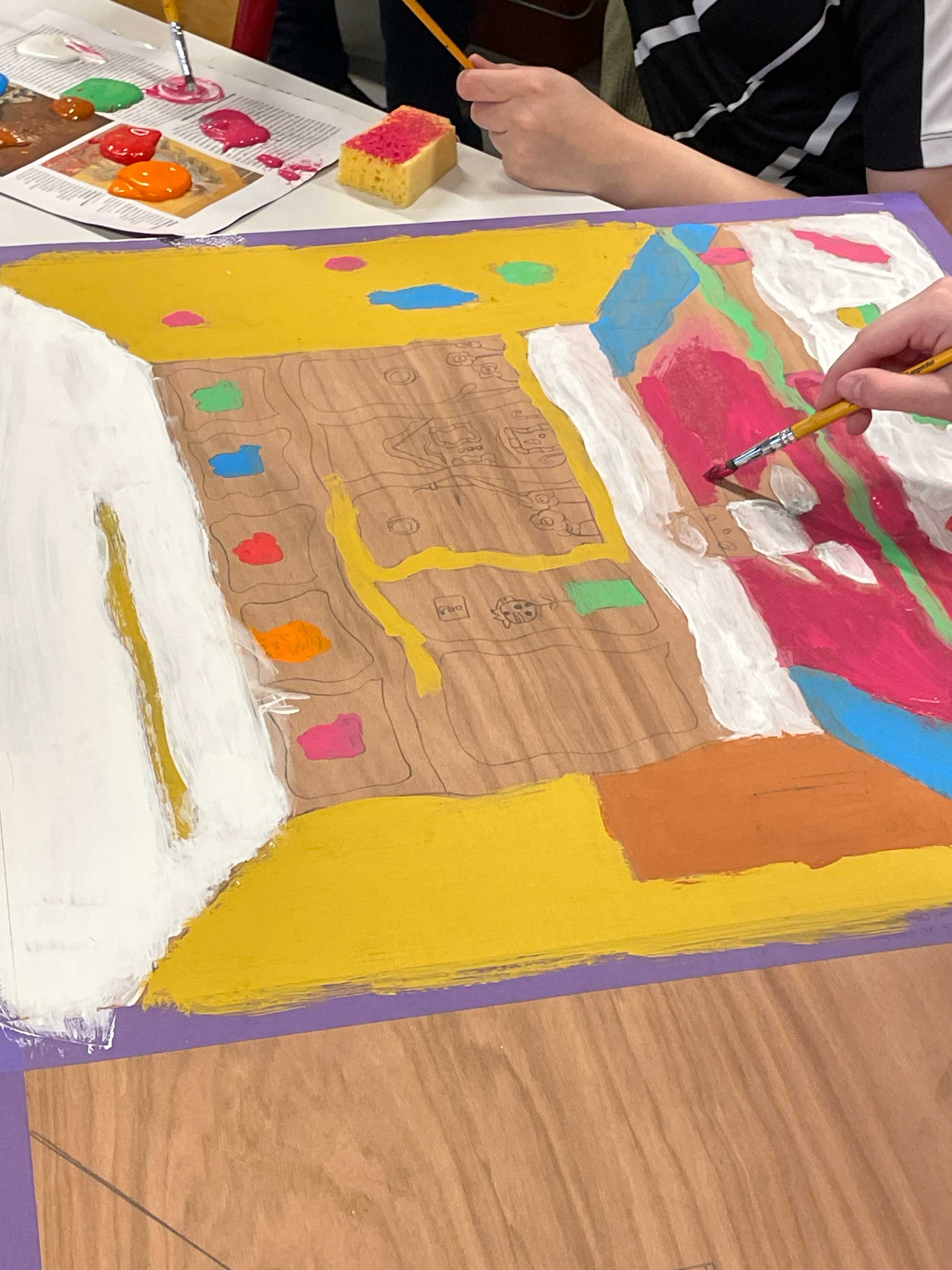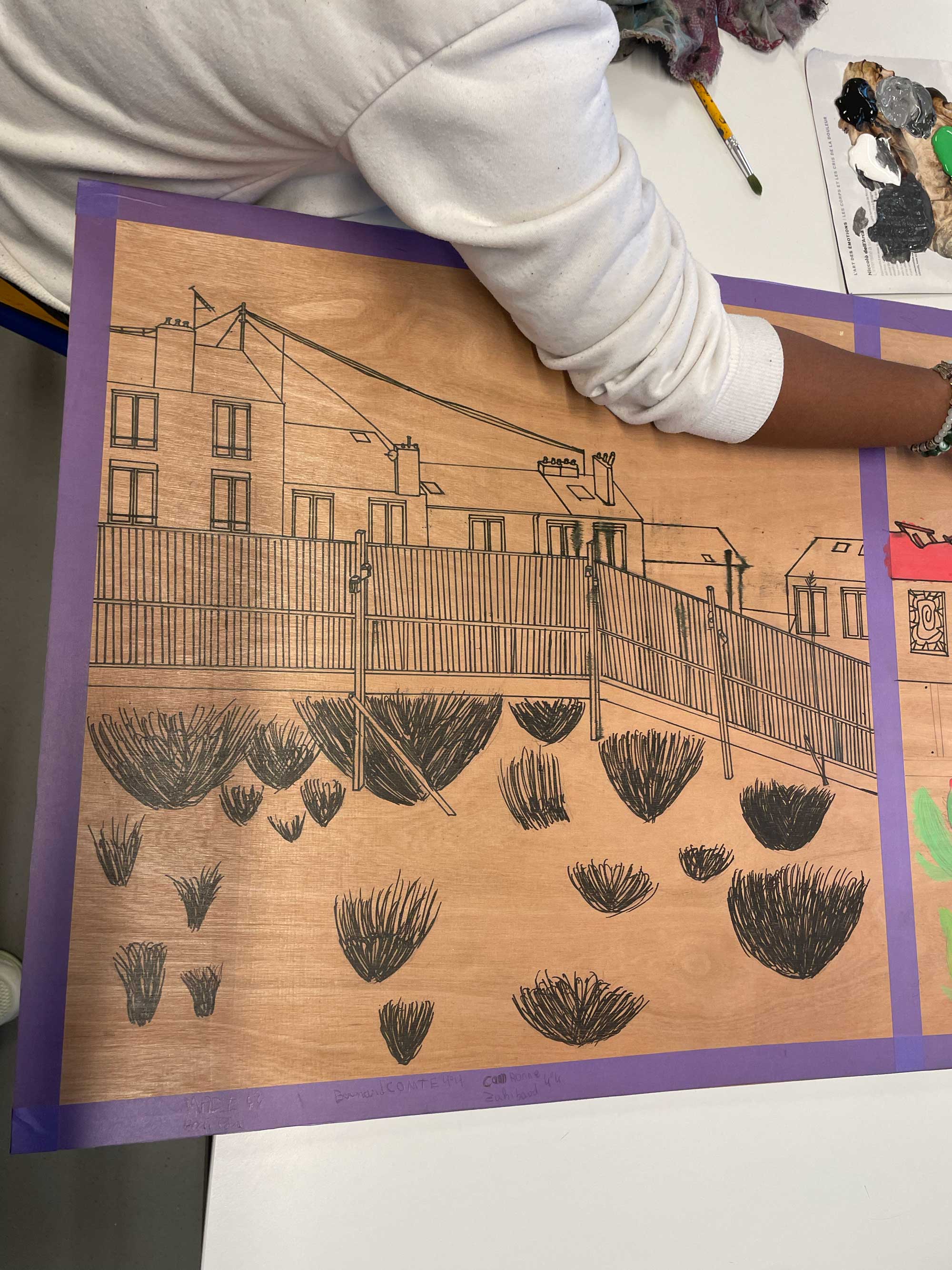 Ce projet de création s’inscrit dans la continuité des explorations menées depuis le début de la résidence : regard porté sur l’environnement proche, observation du paysage urbain, exploration de la couleur comme outil d’interprétation, travail de composition graphique, réflexion sur la transformation du réel à travers divers procédés plastiques… Ces différents axes, abordés au fil des séances précédentes, ont été convoqués ici pour nourrir la réflexion artistique des élèves et leur permettre de réaliser ce travail.