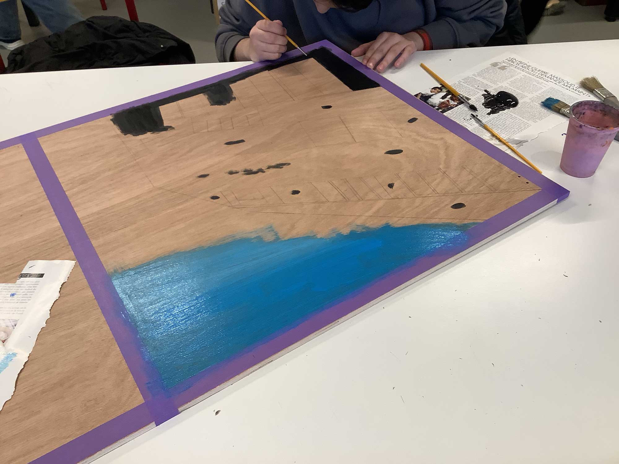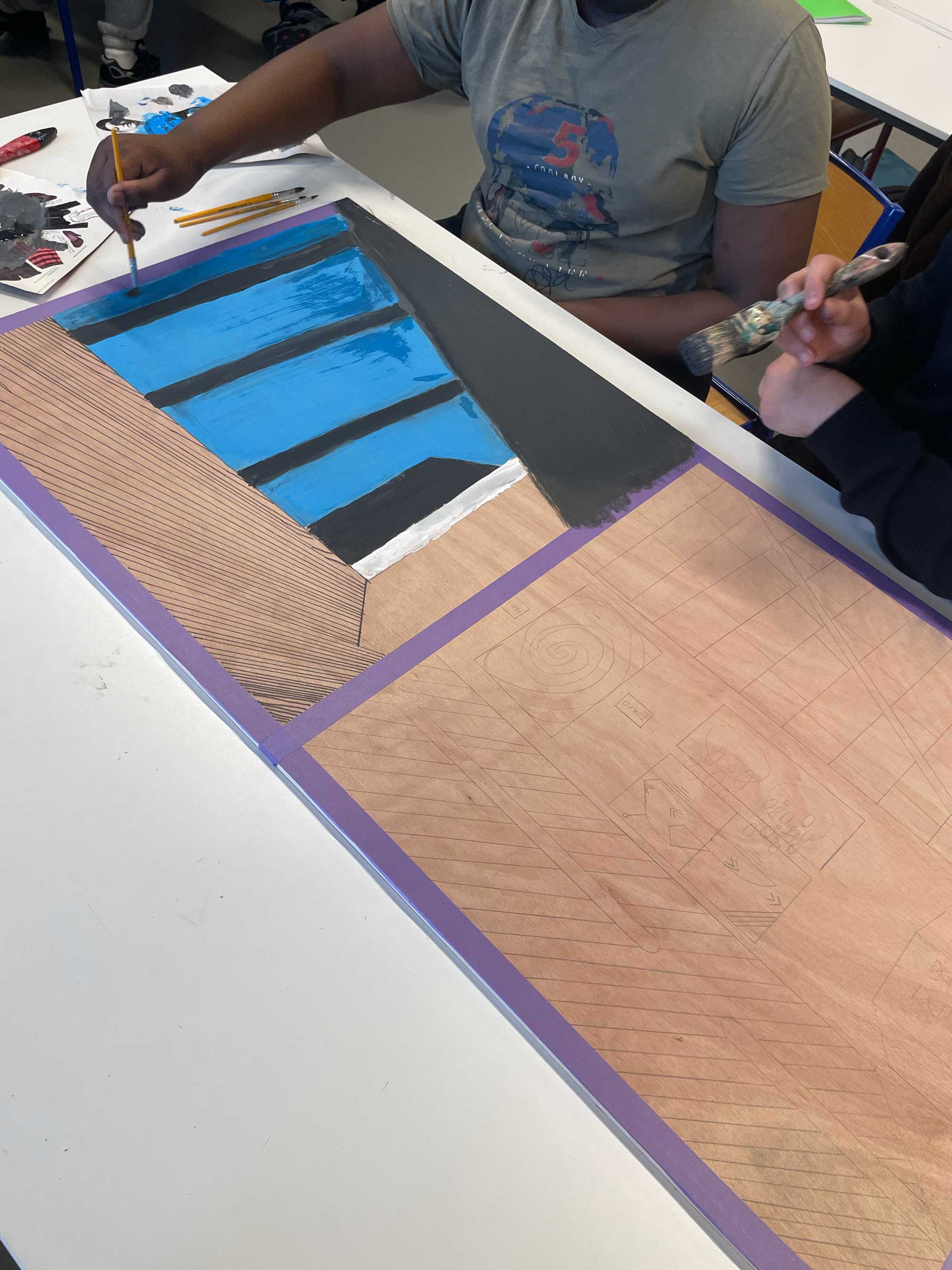 Ces deux visions ont ensuite été agrandies et reportées sur de grandes plaques de contreplaqué, afin de créer des diptyques monumentaux. Le passage au grand format a transformé leur rapport au dessin, les incitant à repenser les gestes, l’espace, et la coordination entre les différents membres du groupe.
