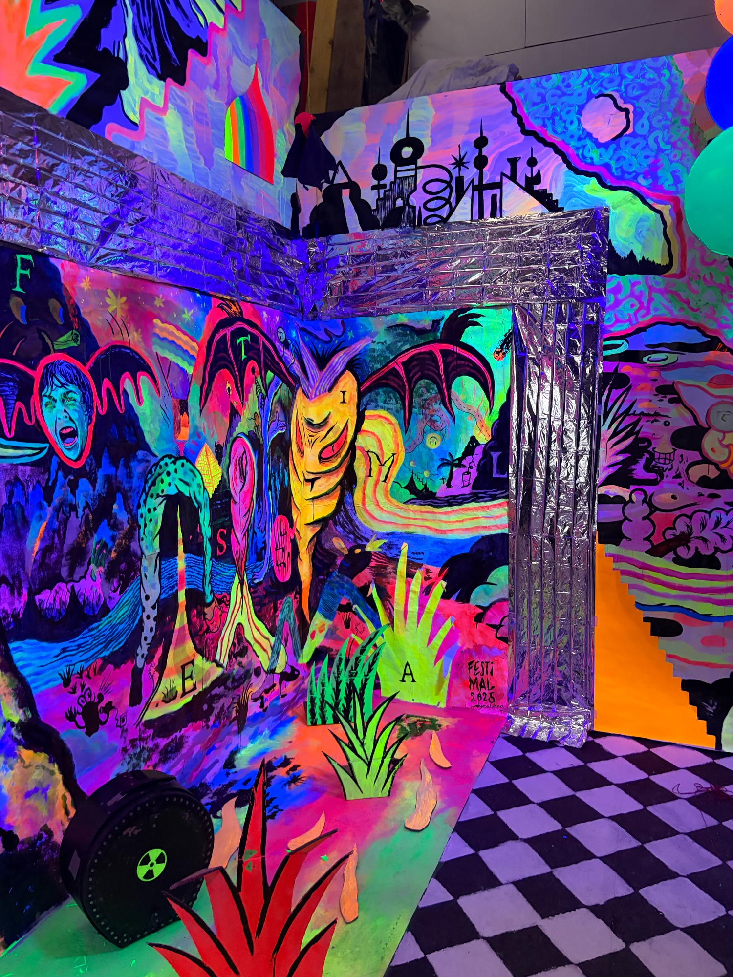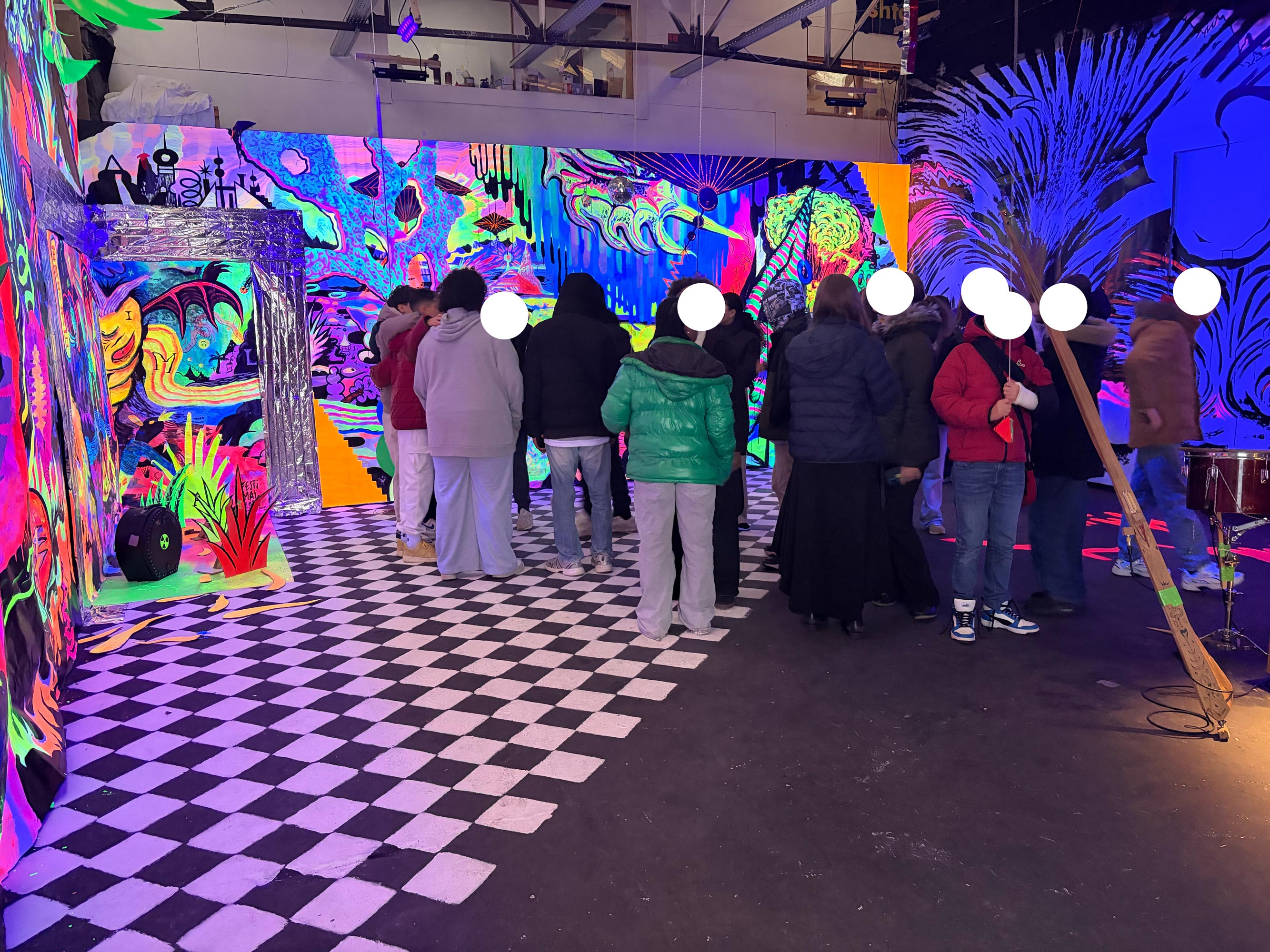 Durant cette séance, nous sommes allés à Spraylab, un lieu culturel un peu différent d’un musée. On a découvert le travail de l’artiste John Caldera avec des installations utilisant de la peinture fluorescente et des effets de lumière.