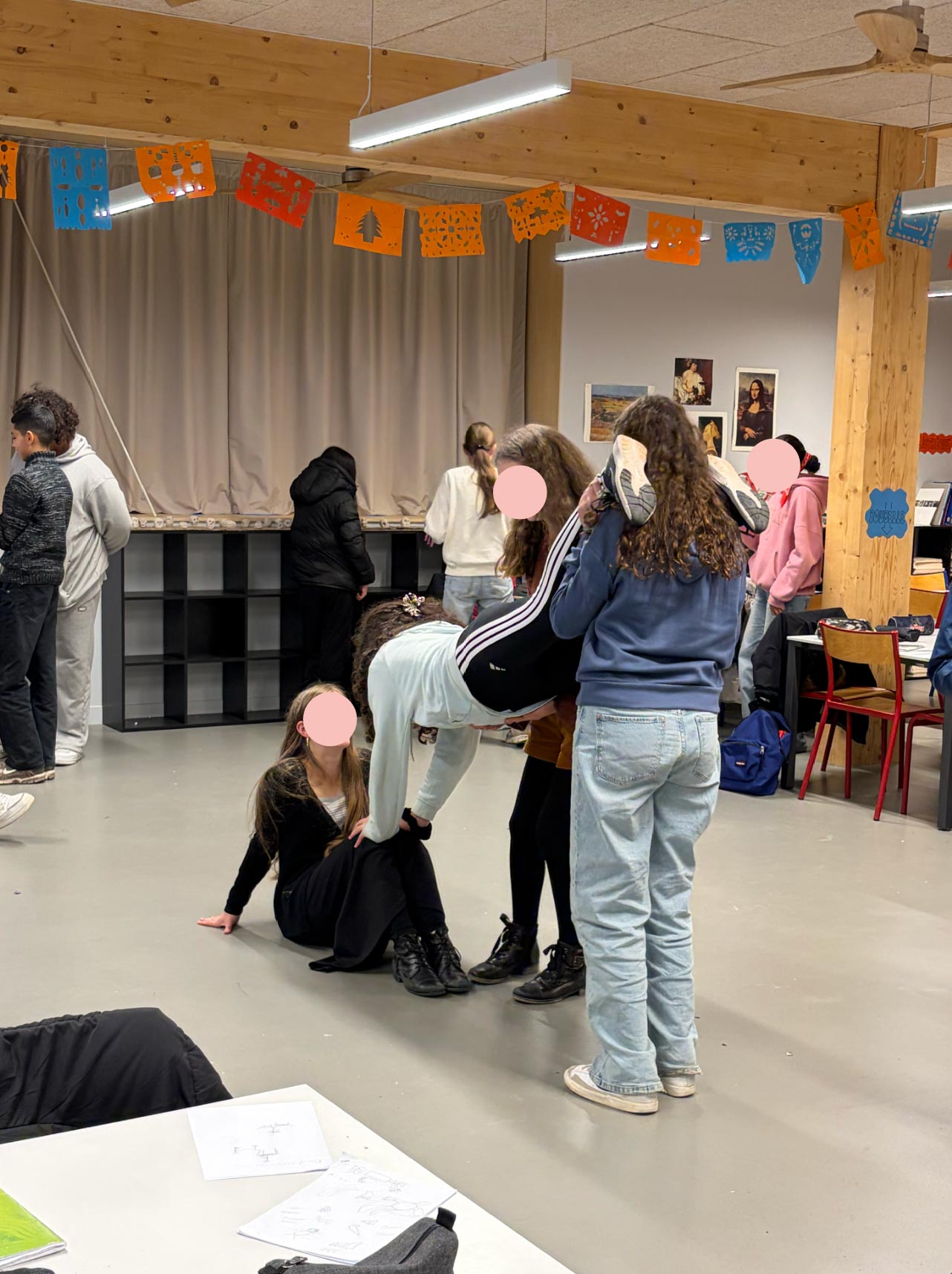 Durant cette séance, on a refait les mouvements qu’on avait observés au gymnase avec la classe de 5e. On devait les rejouer en groupe et les prendre en photo en mode rafale avec les téléphones.